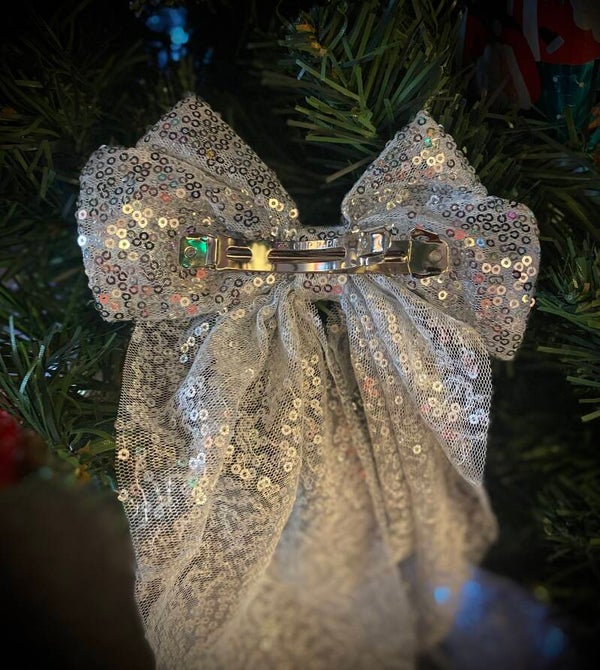 Perfect seasonal statement glitz! Handmade silver sequin hair bow
